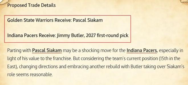 比如,美媒《Fadeaway World》便提出了一套2换1的交易方案,建议勇士将巴特勒和2027年的首轮签送到步行者,换回前锋西亚卡姆。