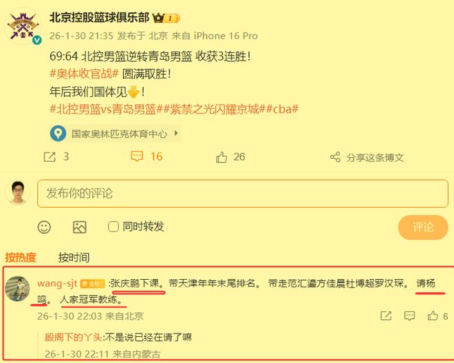 总而言之一句话,张庆鹏执教成绩不稳定已经成了他身上的标签,所以都希望北控管理层这一次能够抓住这个机不可失失不再来的机会果断签约更高水平的杨鸣。